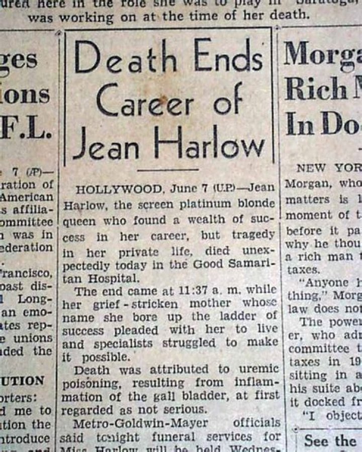 Jean Harlow, the glamorous Hollywood icon of the 1930s, died at the tragically young age of 26 from uremia, a condition caused by kidney failure.
